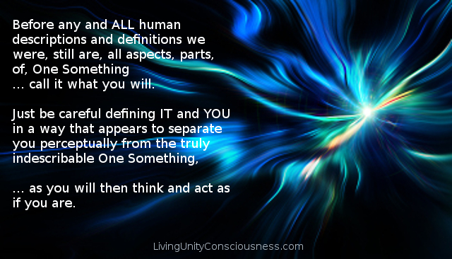 Before any and ALL human descriptions and definitions we were, still are, all aspects, parts, of, One Something